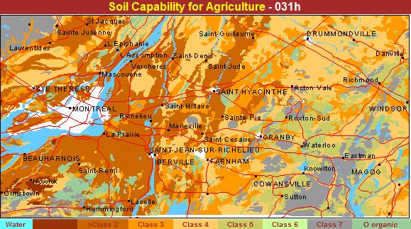 Most soils of the Laurentian Highlands and Eastern QuBbec Uplands are only suitable for growing perennial forages and are rated Class 5, or they are totally unsuited for agriculture and are rated Class 7. Unfavorable relief, excessive stoniness, and shallowness are the main limitations. Sand and gravel are taken from most of the outwash deposits and important gravel pits are located south of Waterloo and Brome lakes. Although the soil removal and scarred relief are man-made, these regions have no capability for agriculture and are rated Class 7E/T. Because of steep slopes, the other nonagricultural areas are rated Class 7T. Organic soils are presently only partly used for agricuIture. The improved organic soiIs around Sainte-ClothiIde-deChateauguay and Sherrington are intensively used for vegetable production.