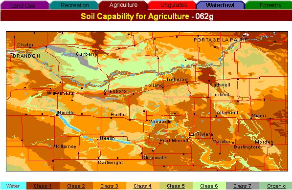 The agricultural capability classification from the 1:250'000 CLI is superimposed on a digital terrain model. The shaded relief enhances the relationships between the capability classification and the geomorphology , soils and glacial and post glacial history. The warm coloured hart of the map is formed by the glacial delta of the Assiniboine river. The former glacial lake beaches, starting at the slopes of Riding Mountain National Park in the top-middle of the map image, diagonally devide the right half of the map: The glacial lake plain with lacustrine clay deposits on the east side, and a predominance of ground moraine material on the west side.