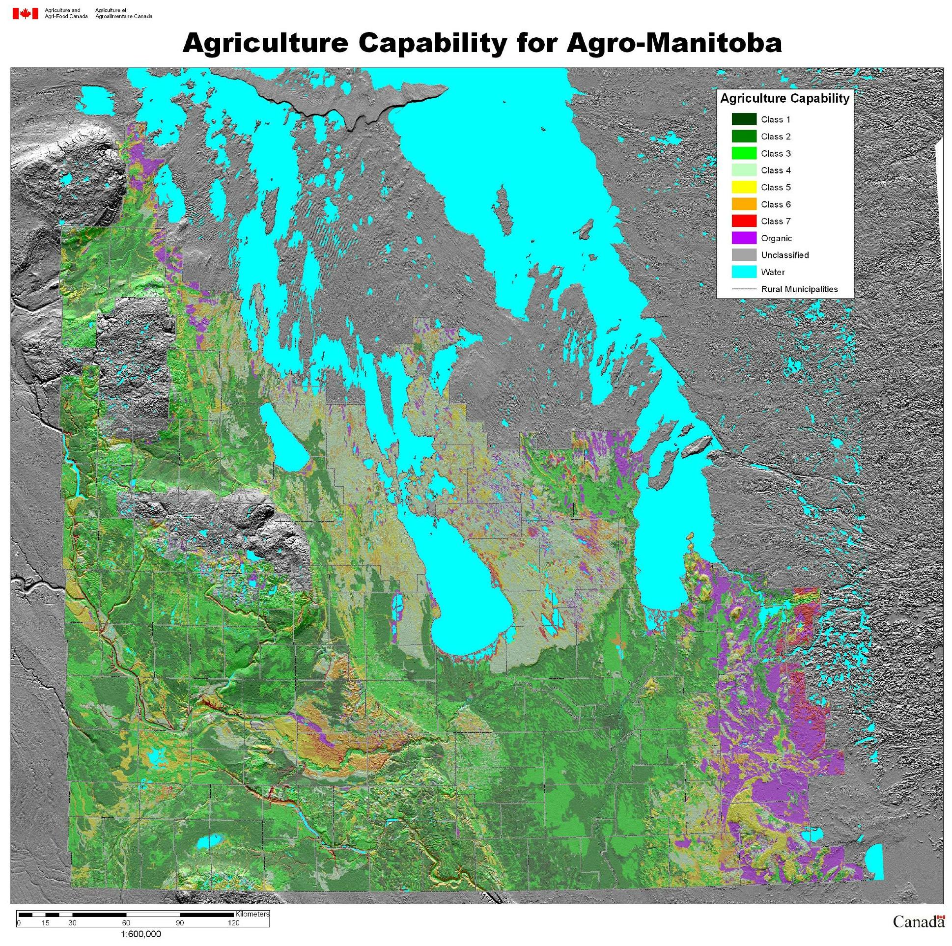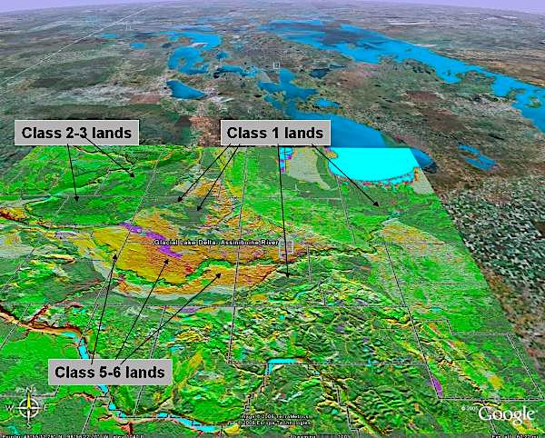 Canada Land Inventory (CLI) capability with relief enhancement gives a Google Earth like visual display of one of Canada's most comprehensive knowledge bases. This digital map was prepared by Glenn W. Lelyk, specialist in Land resource applications in the Land Resource Unit- Manitoba of Agriculture and Agri-Food Canada, University of Manitoba Campus, Winnipeg, Manitoba.