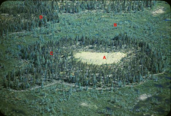 A typical example of the type of permafrost landforms in wetlands is provided by the photograph below taken from a Beaver aircraft in 1972. Area A shows a collapse scar where permafrost has melted. The small black spruce trees are slowly being submersed in the waterlogged scar. The area around B is typical of the non-frozen wetland. Sparse growth of Tamarack (Larix Laricina)-light green tree- can be seen here in a poorly developed ribbed fen. Drainage is from right to left. Around D is a typical growth of stunted Black Spruce (Picea Mariana) can be seen. Light coloured ground cover between the spruce is a combination of lichen and mosses.