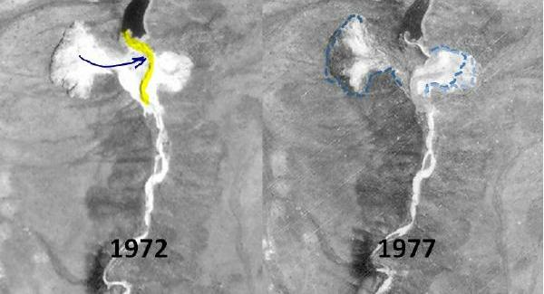 Canada's National and Provincial Air Photo Libraries provide an important environmantal baseline to measure and visualize change. The 1950 National Airphoto Library photo (A12847-144) was taken on August 2nd, 1950 at a height of 20'000 ft. Original scale 1:40'000. The pink arrow shows the flow direction of . The slide, on the south facing slope occurred as a sudden event blocking the flow of the creek and creating a small lake upstream. The drainage channel was pushed into the opposite slope which started to collapse. Both sides continued to melt, but most of the regression in the following decade is in the north facing slope. The 1953 airphoto (A13753-22) was taken on 27 July from 35'000 ft.