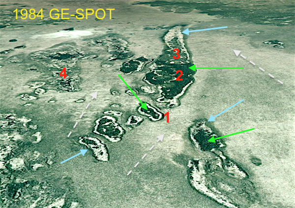 PHOTO 2: The 1984 Google Earth image, source SPOT image, shows approximately the same area. Significant melting has occurred in the 59 year period. Some of the melting areas are identified by blue arrows. Melting and collapse of the edges of the peat plateaus is most common. The light green arrows show mature stands of Black Spruce. These areas have not been burned in this period. The area just surrounding (3) was burned in the early 1970's, but permafrost is still present, although the 'tail' area -blue arrow- point to a large melted part. The gradient of the wetland is in the order of 1 meter per kilometer, drainage flow indicated by the grey dotted arrow. Typical active melting edges show a loss of 20-35 meters of permafrost over a 59 year period which averages out to between just over 0.3m to 0.6 meters per year.