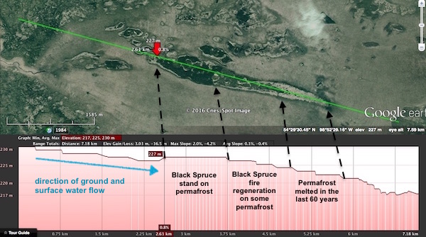 PHOTO 1 below: 1925 Oblique aerial photo of a long peat plateau near Waskik Lake and the Minago River in Northern Manitoba. The numbers 1, 2, 3, 4 all indicate permafrost areas on peat lands. The large peat plateau (2, 3) is about 3400 meters in length. Although small collapse/ melted areas can be seen in the center of the plateau, the edges of the peat plateau are still intact- no significant melting visible. The area around 4 was burned perhaps about a decade before (around 1915): significant melting has already occurred here (i.e. before 1925) but the center core still has permafrost and has regenerated in black spruce with some white birch.