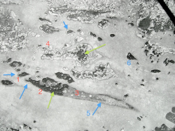 PHOTO 6 above: A detail of the above photo 5- red outlined area. Active melting areas are identified by blue arrows. Some indications of surface water can be seen there.