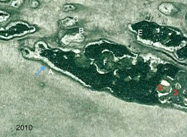 PHOTO 7: 1984 Satellite Image. This Google Earth image shows a significant amount of change from the 1968 photos. Melting around the peat plateau edge is prominent. The small palsas B and C have disappeared.