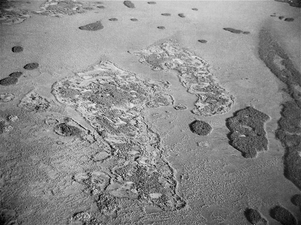 PHOTO 12: 1925 oblique air photo shows the tail end of the peat plateau and a series of smaller palsas in a large tamarack fen wetland. While the area north of the wetland shows all signs of a fire regeneration, the palsas and the tail were not touched by that fire. Note that the edges of the of the palsas and tail of the peat plateau do not show any sign of melting---yet. In fact, this area appeared quite stable until 1955.