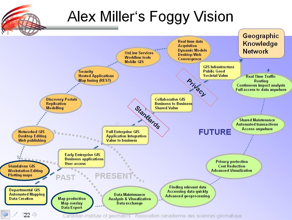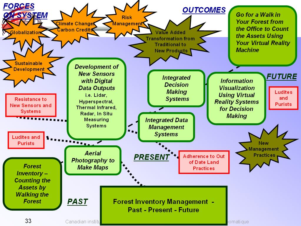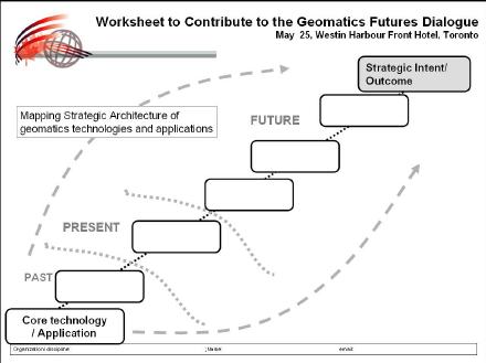 Participate by submitting your strategic foresights in the form of a strategic architecture diagram, (see figure below) in essence a thumbnail sketch of your vision of the future. The Strategic architecture allows us to assemble this information into a strategy map for: The Future of Geomatics for Disaster and Risk Management.