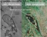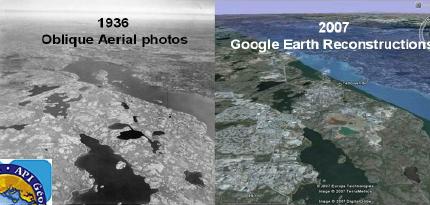 Yellowknife,conference town and capital of Canada's Northwest Territories did not exist before 1936. The oblique aerial photo was taken as part of a systematic aerial survey program to map Canada's extensive northern lands. The same image perspective was reconstructed with Google Earth imagery showing the state of development in "2007". Just off the photos to the right, on the east side of Yellowknife Bay, is the First Nations community of Dettah which was settled around the 1800's.[+]