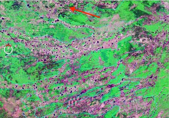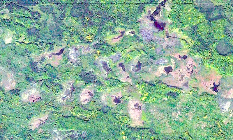 Figure 2: High Resolution Detail of Beaver dams and Ponds. This is the Yellow circle area enlarged. Drainage is to the right. Beaver dams, ponds and lodges are clearly visible.