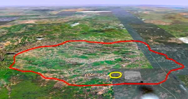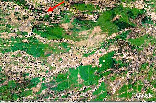 Figure 5: This Apple Maps image capture, probably later than 2010. It provides a detail of th landscape near the point of the red arrows on the images of figures 3 and 4. This is a fall image which shows the yellow leaves of the poplar so common in this landscape.