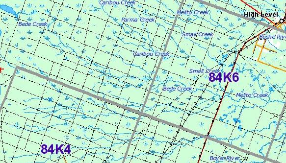 Figure 1: High Level Beaver Landscape, Alberta , Canada . This low resolution oblique Google Earth image (Digital Globe) shows an unusually high concentration of beaver dams in in all the drainage channels. All the creeks (Bede, Caribou, Parma, Melto etc.) have been transformed by beaver into a long strips of beaver ponds and beaver controlled lakes. The Mackenzie highway is visible as the thin grey line in the high resolution strip on the right side of the image. the town of High Level, Alberta is just to the north of the east of the red outline on the Highway.