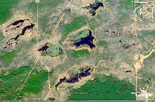 Figure 3: This vertical Google Earth image shows the widespread distribution of beaver dams and ponds in all creeks. The Green areas in between are slightly higher and covered with forest which show signs of repeated forest fires.