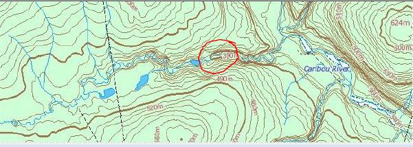 An excellent selection of sites in the Yukon showing significant slides and regression of permafrost in mineral soils was made available on Google Earth by "kingpointnorth" (Google Earth BBS link no longer available, but this link is to my record of his locations) in 2005. Some of the sites he found have a high resolution satellite image coverage. An example is the Caribou River Thaw SlideRiver which I describe below in more detail.