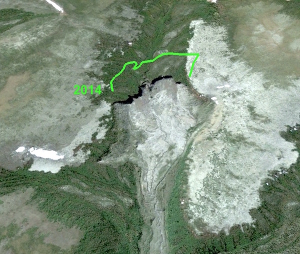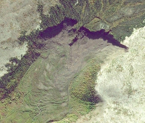 In this study area the image below in Figure 5 shows the Thaw slide area in and around 2014-15. The resolution is in this case comparable to the GE image used dated 2004-06-16.