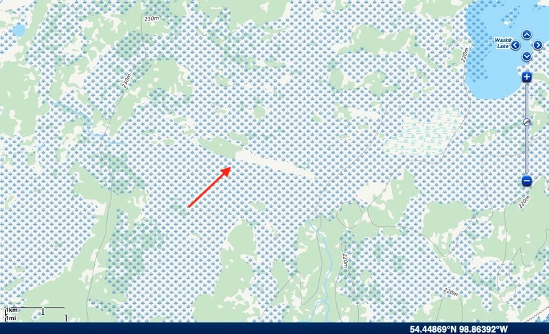 MAP2: Section of Present Topographic map available from Natural Resources Canada. The red arrow points to the permafrost landform mapped on the 2018 topographic map base of Canada. The actual length of the peat plateau was 3.5 kms. Present length of the permafrost part is 2.3 Kms. The contour lines on map 2 show relief of the study area is between 230 and 220 meters above sea level. The elongated peat plateau of this study follows the subtle sloping wetland surface along this height differential more or less perpendicular to the countour lines