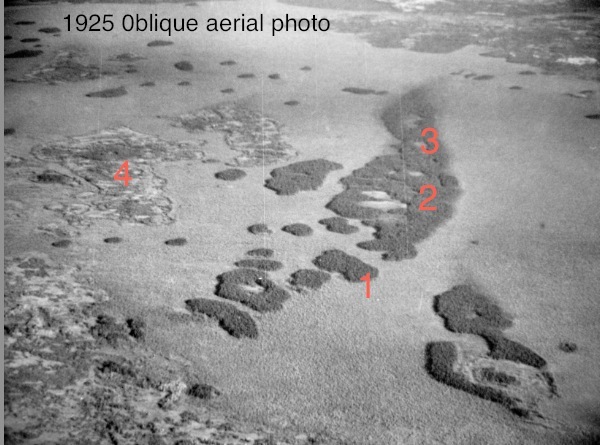PHOTO 1 below: 1925 Oblique aerial photo of a long peat plateau near Waskik Lake and the Minago River in Northern Manitoba. The numbers 1, 2, 3, 4 all indicate permafrost areas on peat lands. The large peat plateau (2, 3) is about 3400 meters in length. Although small collapse/ melted areas can be seen in the center of the plateau, the edges of the peat plateau are still intact- no significant melting visible. The area around 4 was burned perhaps about a decade before (around 1915): significant melting has already occurred here (i.e. before 1925) but the center core still has permafrost and has regenerated in black spruce with some white birch.