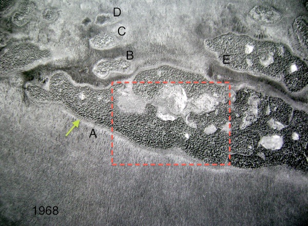 PHOTO 5: Part of the peat plateau in 1968. No melting around the edge can be seen, as was also noted in photo 4 -green arrow. Melting can be seen in the collapsed areas in the centre (see also more detailed image below), but melting rates are quite slow.