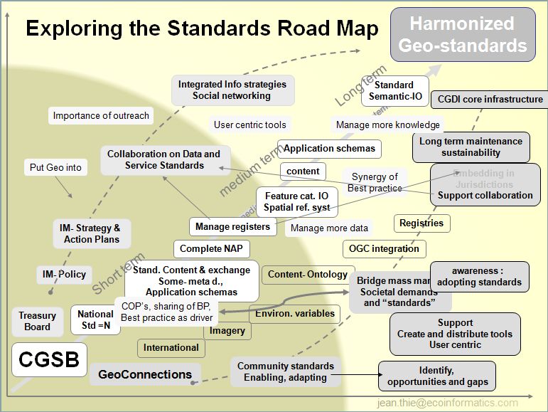 On January 24, 2008, CGSB-CoG, CAC- ISO/TC211, the Treasury Board of Canada Secretariat, and GeoConnections held a “Seminar on Canadian and International Standards in Geographic Information / Geomatics” . Jean Thie of the Canadian Institute of Geomatics acted as the moderator. The seminar reported on existing Canadian and international standards in geographic information, provided an understanding of their implementation and benefit for interoperability, engaged stakeholders into their adoption, identified current and future requirements, and contributed in further development of standards for sustainable geographic data management in Canadian departments and for the Canadian Geospatial Data Infrastructure (CGDI). Over 50 people participated to the seminar. At the end of the day, stakeholders and participants contributed in sketching elements of main interest in a road map following three axes: (1) national and international standards, (2) Treasury Board of Canada Secretariat, and (3) GeoConnections.